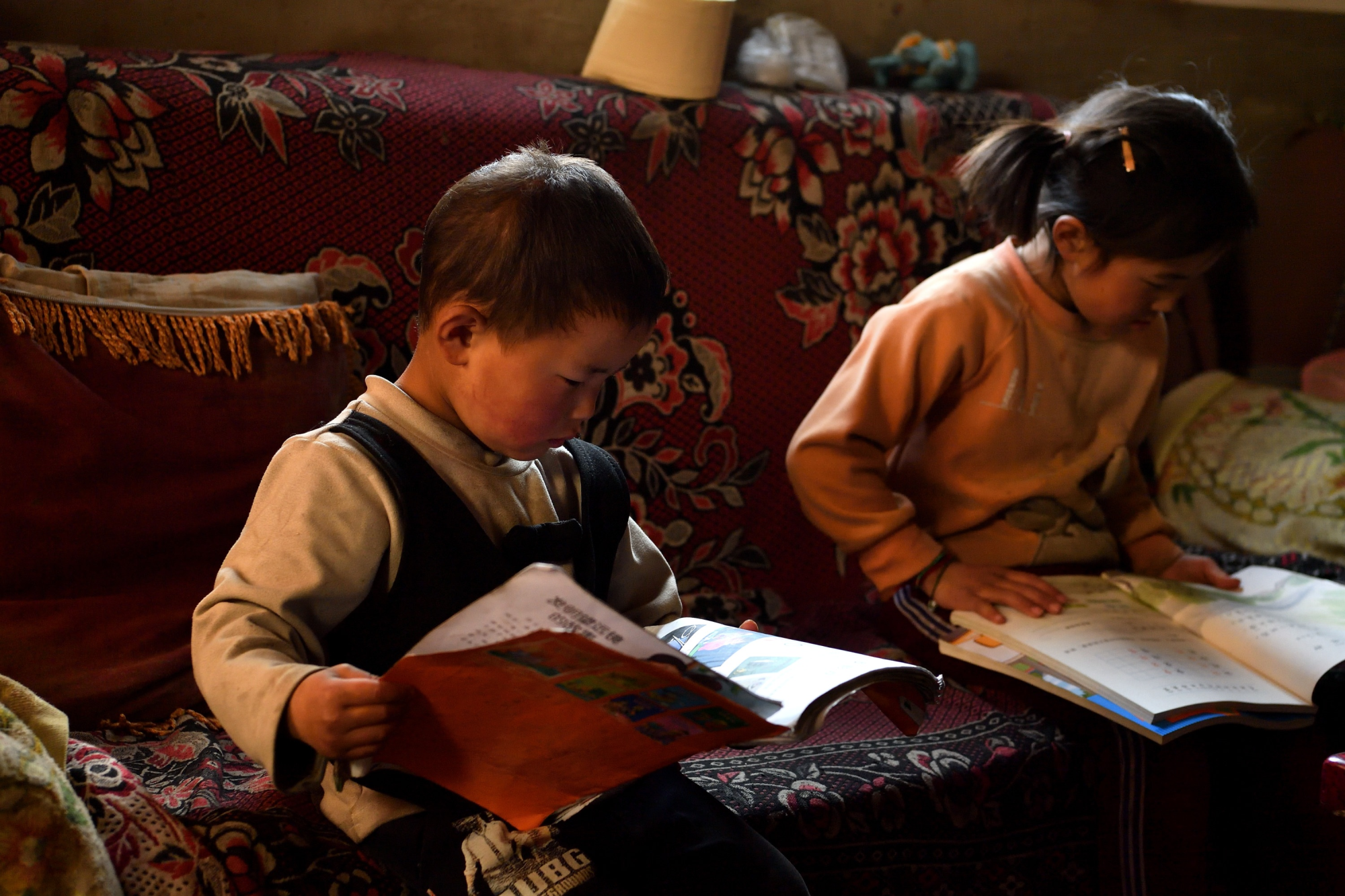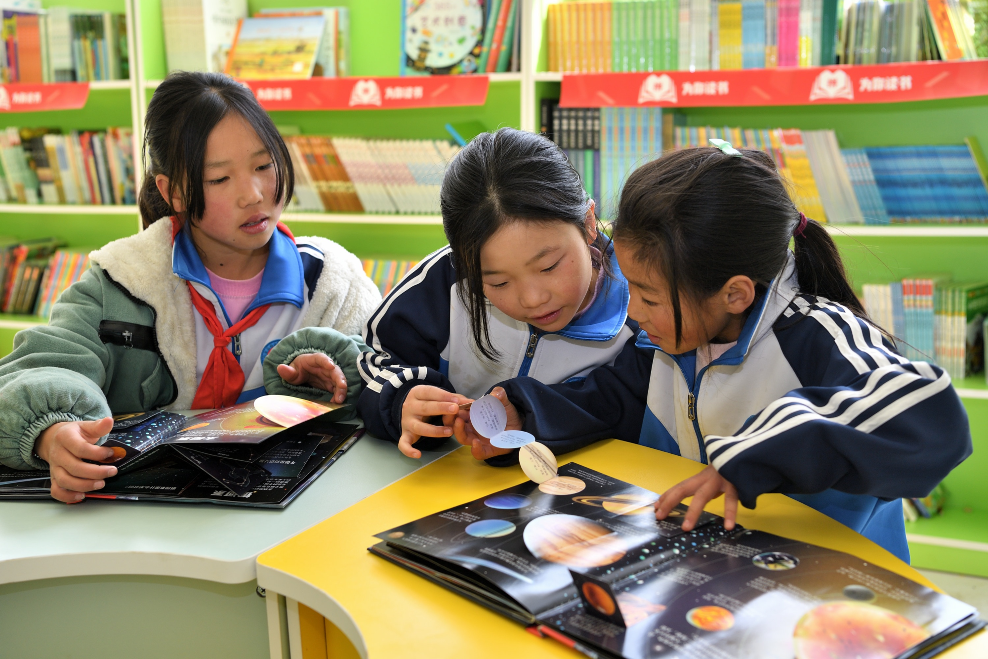 ▲药山镇中心小学的同学们在新阅读室阅读新书。摄影|陈逸航